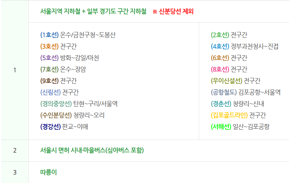 🚉 예외적으로 이용범위 냉 역에서 승차 후, 5호선(미사~하남검단산), 7호선(석남~까치울), 공항철도(인천공항 1 터미널~인천공항 2 터미널)에서 하차하는 것은 가능합니다.(해당 역에서 승차는 할 수 없음)