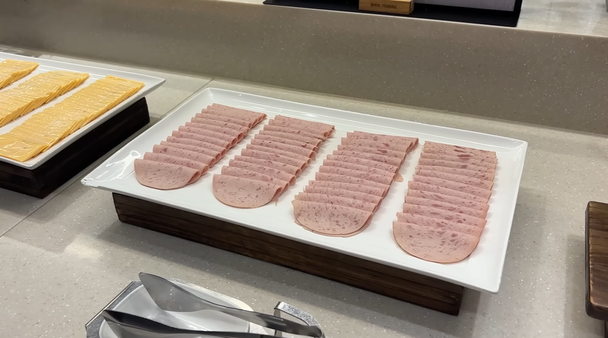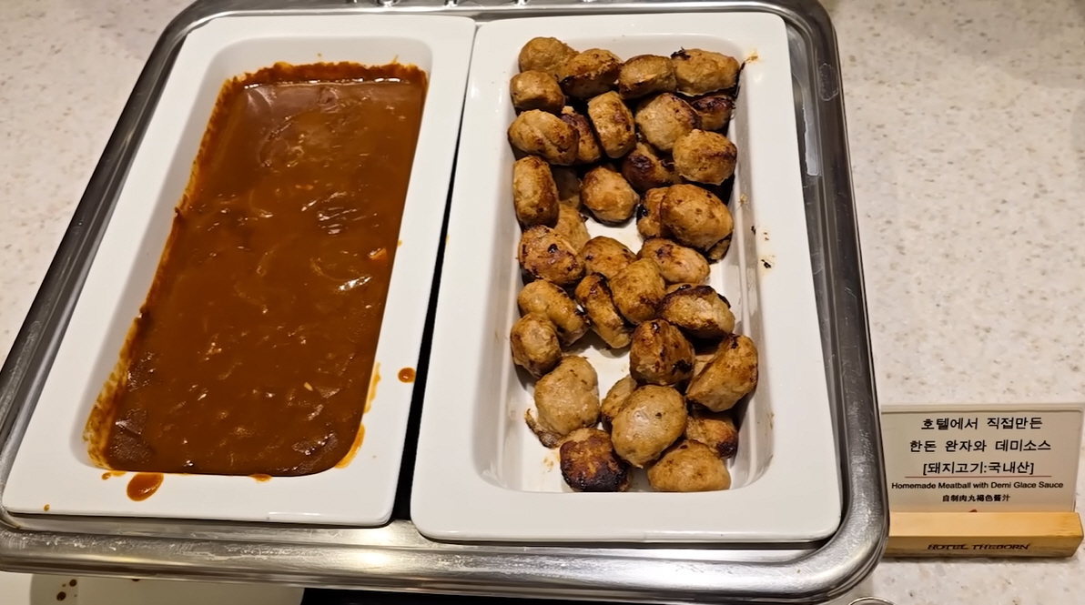 더본호텔에서 직접 만든 소시지, 간장돼지불고기, 폴드포크, 과일 등 이 구비되어 있고