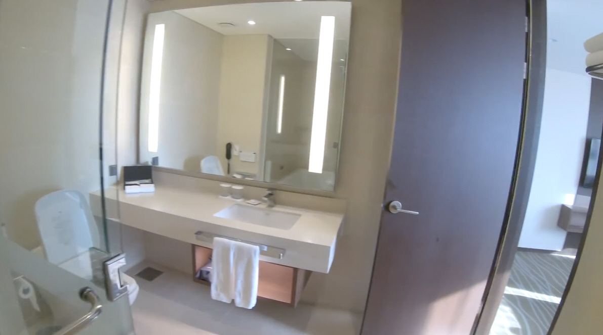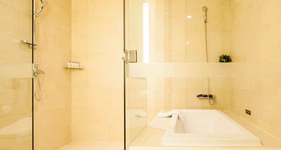 그리고 화장실이 넓고 깔끔합니다. 한 가지 색상으로 심플한 느낌을 주고 욕조가 커서 관광 다녀오시고