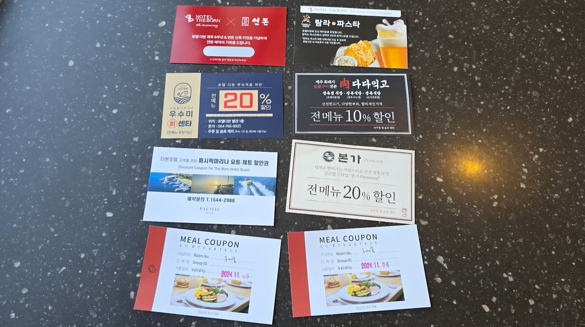 다녀오시면 조식쿠폰하고 주변 음식점 쿠폰이에요. 그리고 백다방 커피 쿠폰도 주니 시원한 커피 한잔씩