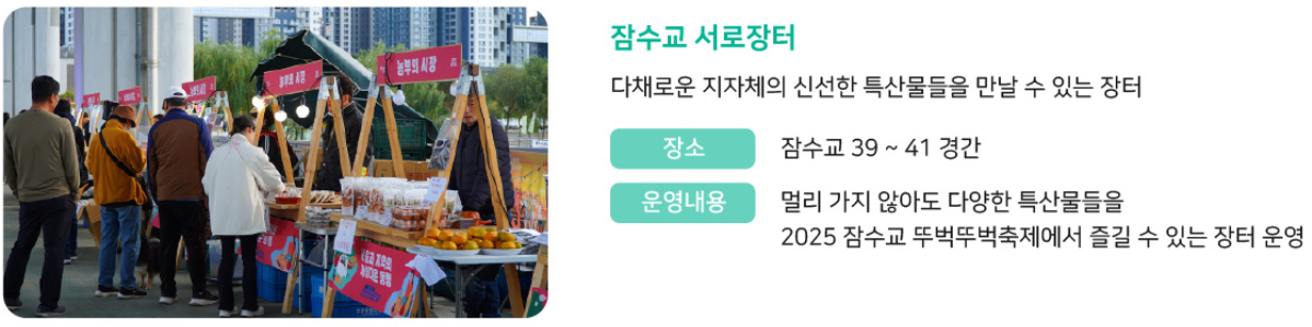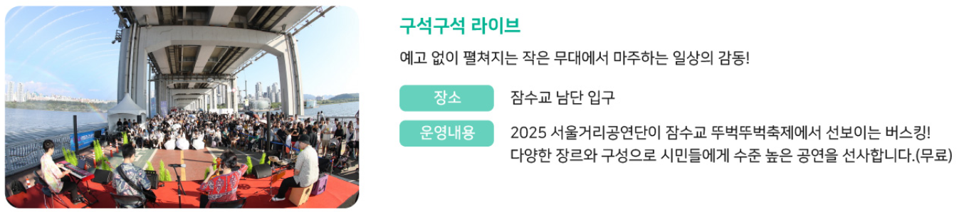 이외에도 서울과 한강의 매력을 담은 포토존 '컬러풀잠수교', 잠수교의 명물 '달빛무지개분수', 아이들을 위한 '대형 에어바운스', 음악 • 마술 등 다양한 장르의 거리공연, 지역 농가와 함께하는 '서로장터'등 다채로운 프로그램이 진행됩니다.