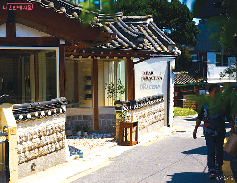 재동초등학교 앞 삼거리에서 나무모던 앤 컨템퍼러리 아트 갤러리 쪽으로 들어가는 골목길입니다. 번잡하지 않아 한옥의 고요한 정취를 오롯이 느낄 수 있습니다. 전통 홍염 공방은 오래된 한옥에 자리하고 있어 잠시 발길을 멈추기 좋은 공간입니다. 맞은편 향수 가게에서 풍겨오는 은은한 향이 골목 산책을 더욱 즐겁게 만듭니다. 미지와 호수희 첫 서울 데이트 장소 이기도 합니다.