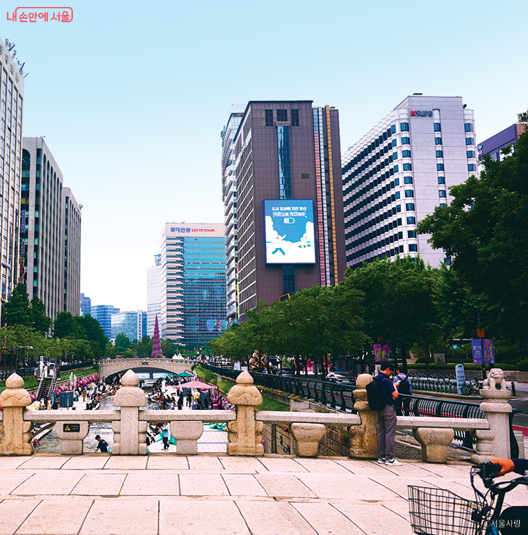 미지와 호수가 함께 데이트를 하고 쉬어 가는 곳입니다. 한빛광장은 청계천 옆 미래에셋증권 빌딩 앞에 위치한 너른 평지형 광장입니다. 잔디밭과 광장이 어우러져 도심 속 작은 쉼터처럼 느껴집니다. 바로 앞에 흐르는 청계천 덕분에 한 여름에도 시원한 바람이 스칩니다.