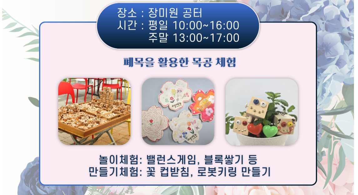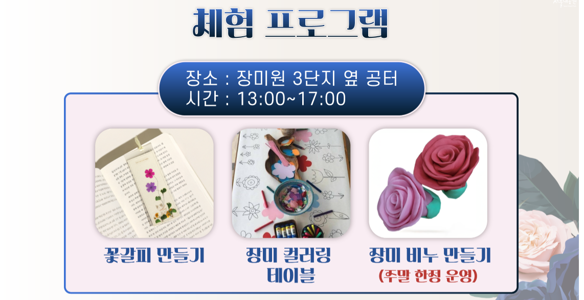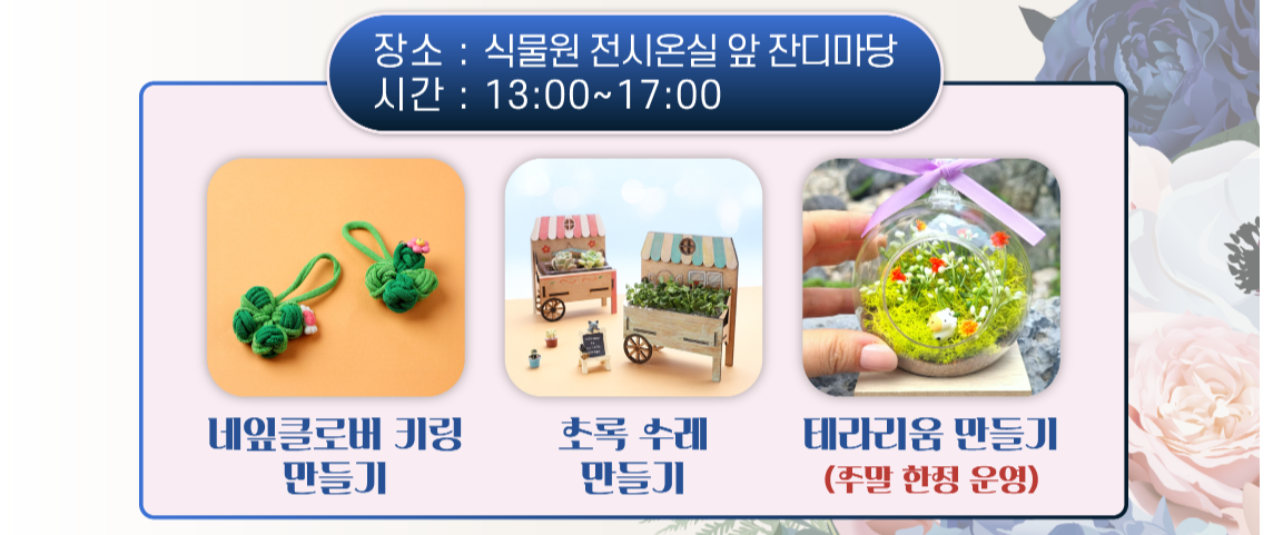 아울러 매일 오후 1시부터 5시까지 장미원 3단지 옆공터에는 꽃 책갈피 만들기, 컬러링 테이블, 목공 원데이 클래스가, 식물원 전시온실 앞 잔디마당에서는 네 잎 클로버 키링 만들기, 초록수레 만들기 등의 체험이 진행됩니다. 주말에는 장미꽃 비누 만들기(장미원), 테라리움 만들기(식물원) 특별 체험이 운영됩니다.