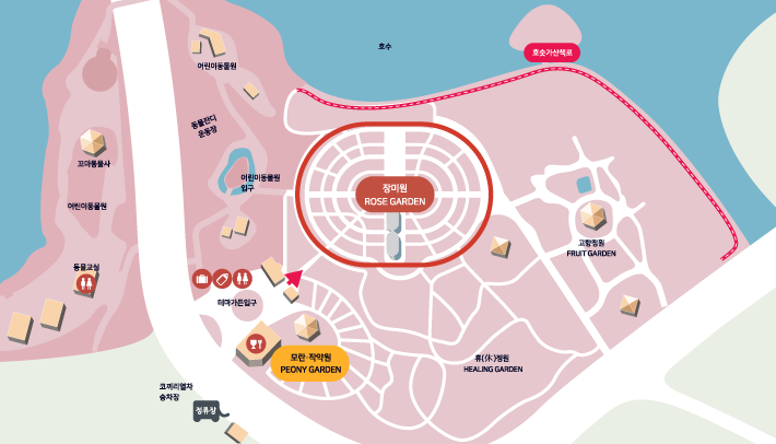한편, 서울대공원 테마가든은 백만송이 장미가 피어나는 장미원은 물론 넓은 잔디밭 위 휴식할 수 있는 휴정원, 장미꽃보다 먼저 꽃을 피우는 모란 • 작약원, 작고 귀여운 동물들을 만날 수 있는 어린이동물원 등으로 이루어져 있습니다.