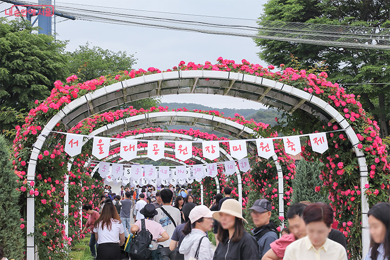 축제가 펼쳐지는 테마공원 장미원은 100여 품종, 4만 5,000주의 장미가 식재된 정원으로, 축제 기간 내내 슈터스골드, 벨베데레, 로즈 오브 샤틀, 체리 메이딜란트, 윈쇼튼, 핑크 피스, 메어리 로즈 등 다양한 장미들이 고유한 색상관 향기를 뽐내면 릴레이처럼 연속 피어납니다.