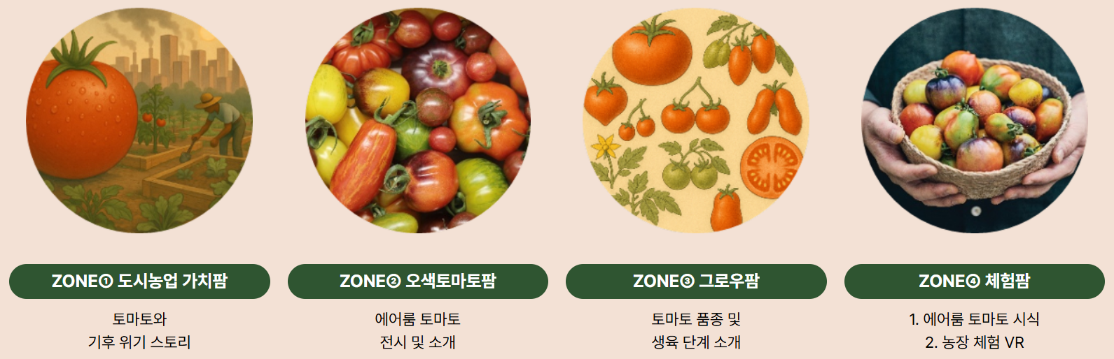 체험팜에서는 VR기술을 활용한 토마토 수확 체험과 함께 에어룸 토마토를 시식할 수 있고, 도시농업 가치팜에 서는 기후변화가 토마토 생산에 미치는 영향과 도시농업의 대응 사례를 조명합니다.
