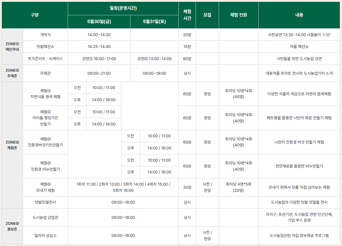 다양한 부대행사도 준비됐습니다. 5월 30일 오후에는 텃밭작물과 화훼 등 식물을 활용한 의상을 선보이는 '텃밭 패션쇼'와 도시농부 유튜버 '솔룸'이 참여하는 '도시농업 토크콘서트'가 진행됩니다. 이어 31일에는 '그래도팜' 원승현 대표와 함께 품종의 다양성과 토양의 중요성을 주제로 '지속가능 도시농업 쇼케이스'도 열립니다.