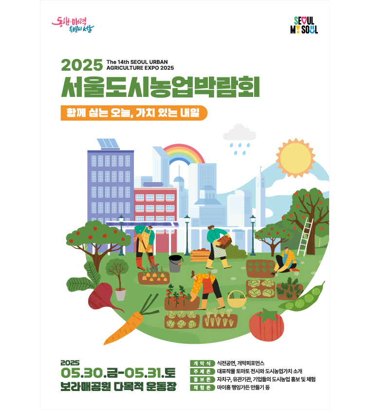 서울시가 5월 30일부터 31일까지 보라매공원 다목적운동장에서 '함께 심는 오늘, 가치 있는 내일'을 주제로 '2025서울도시농업박람회'를 개최합니다.