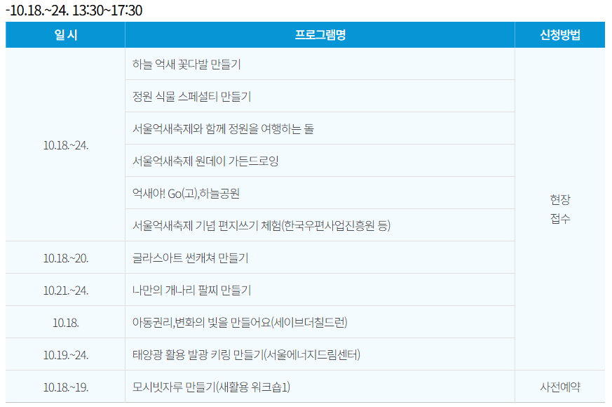 또한 ‘억새 꽃다발 만들기’,‘원데이 가든 드로잉’ 등 15개의 특별한 프로그램이 진행되는 ‘체험존’이 마련되어, 축제를 더욱 풍성하게 즐길 수 있다. 일부 사전 예약 프로그램은 서울시공공서비스예약 홈페이지에서 신청이 가능하다.