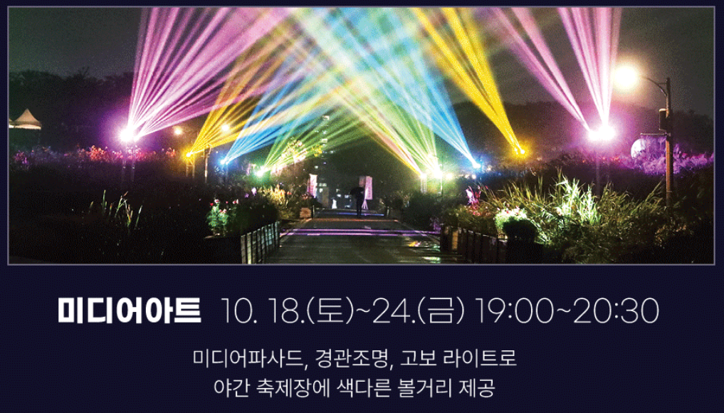 ‘미디어아트’는 10월 18일~24일 오후 7시부터 8시 30분까지 운영한다. 하늘공원 십자로 중앙로에는 상호작용이 가능한 인터렉티브 미디어 ‘빛의 숨결’이 상영되며, 산책로 입구에는 4명의 작가의 미디어 작품을 한데 어우른 ‘버추얼 파빌리온’을 관람할 수 있다.