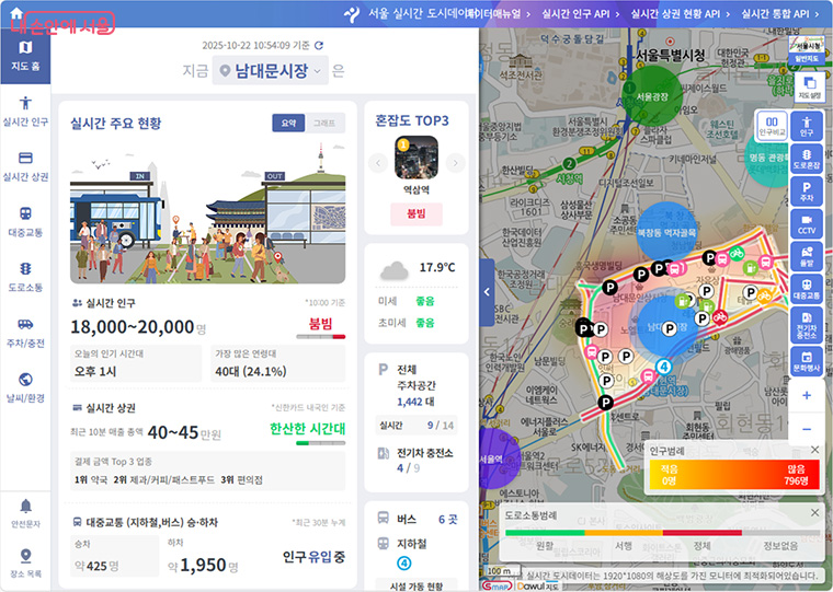 아울러, 서울시는 서울 대표 명소 120개 지역의 인구·교통·환경·문화행사 정보를 실시간 분석해 ‘지금 붐비는 지역’을 확인할 수 있는 ‘서울 실시간 도시데이터’ 서비스를 운영하고 있다. 2023년 조회 건수 5,000만 건에서→ 지난해 1억 1,000만 건,→ 올해 2억 건(9월 현재)으로 빠른 증가세를 보이고 있다.