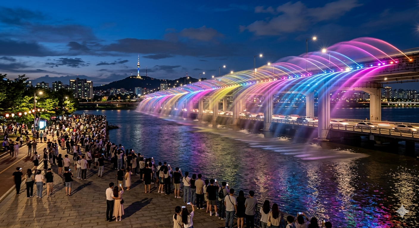 K-POP음악과 어우러진 아름다운 분수쇼를 반포한강공원에서 만나보자. 음악과 빛, 물결이 어우러진 특별한 순간을 선사한다.