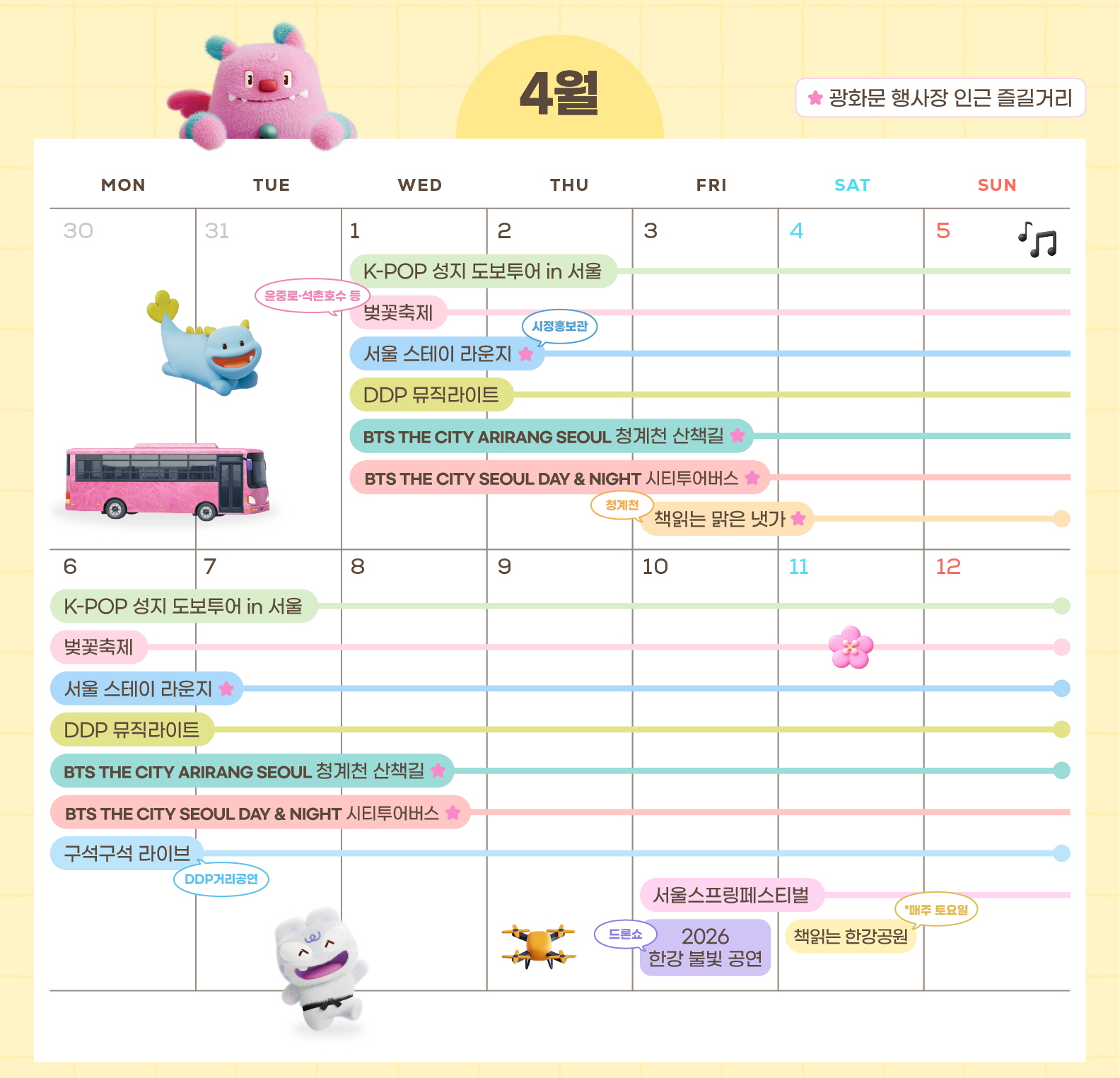광화문광장 인근 플랫폼 10개소(아뜰리에 광화, 해치마당 미디어월, KT스퀘어 등)에서 K-POP 아티스트들이 서울 명소를 걷는 영상과 환영 메시지를 만날 수 있다. 매 시간당 3회(5분, 25분, 45분) 송출된다.