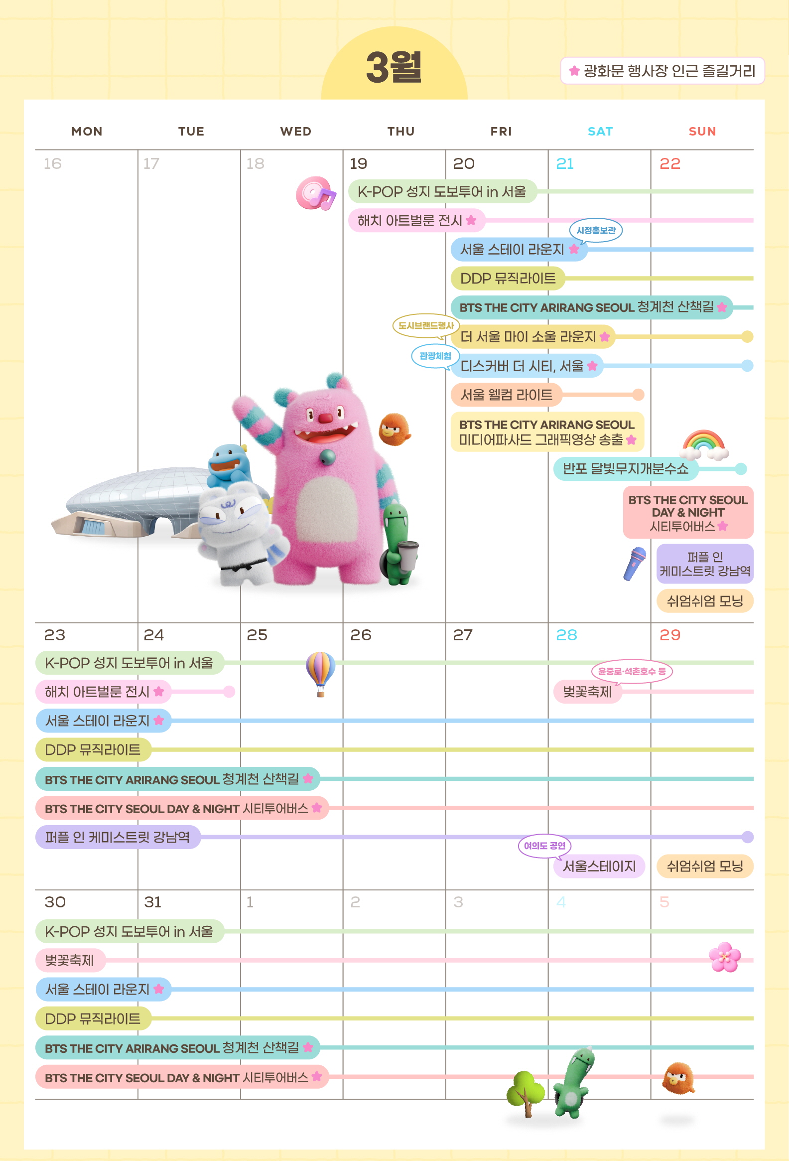 3.22.~4.19. 화~일 19:00~ 광화문, 남산, DDP 등