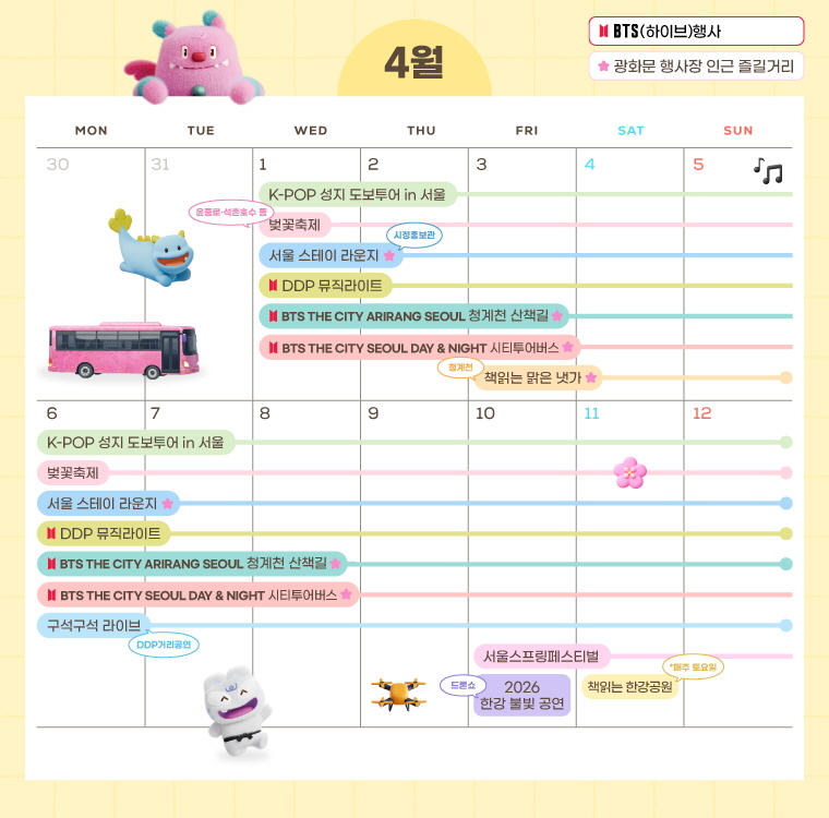 3월 21일 광화문 공연이 진행됨에 따라 K-문화를 사랑하는 전세계 팬들이 서울에 모입니다. 공연을 계기로 서울 곳곳에서 거리공연, 페스티벌 등 다채로운 행사가 펼쳐질 예정인데요. 어디서 무엇을 즐겨야 할지 궁금한 분들을 위해 연계행사를 캘린더로 정리해 소개합니다.