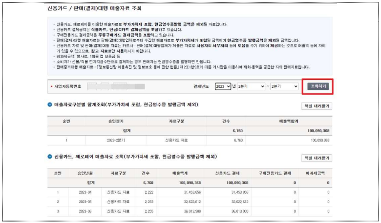 홈택스 ▶ 전자(세금) 계산서• 현금영수증 • 신용카드 ▶ 신용카드 매출 ▶ 신용카드 판매(결제) 대행 매출자료 조회