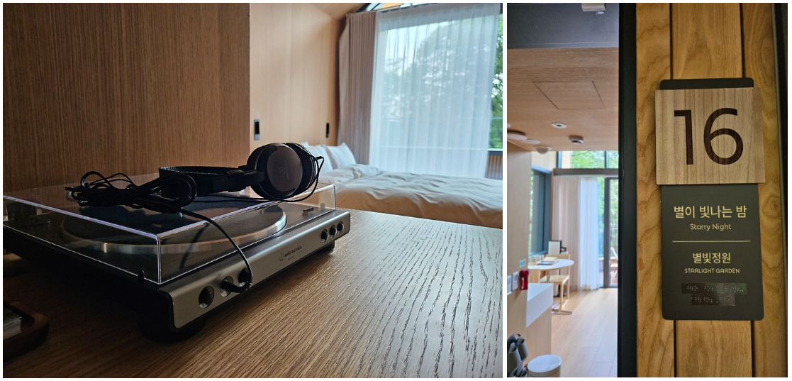 🏠 객실에 준비된 턴테이블과 스피커로 음악 감상이 가능합니다. 단, 본동 2인실은 스피커 대신 헤드셋으로.