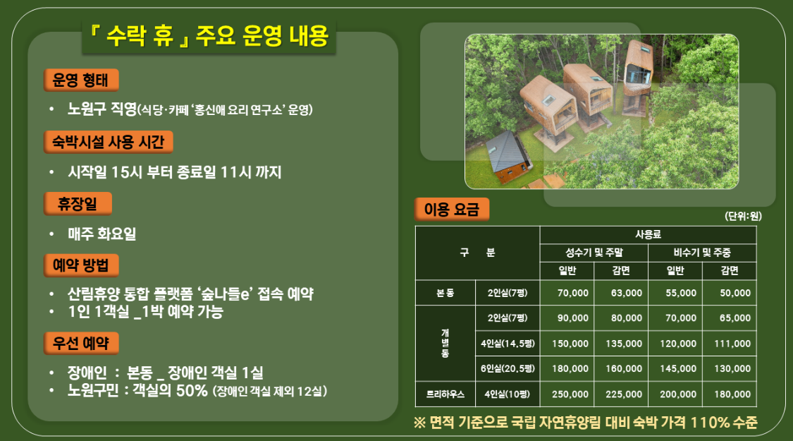 도심 속 자연 휴양림의 새로운 패러다임으로 떠 오를 '수락휴(트리하우스)'가 7월 17일(목) 정식 개장을 앞둔 지금, 앞으로 매달 진행될 노원구민 우선 및 일반 예약에 대해 알아보겠습니다.