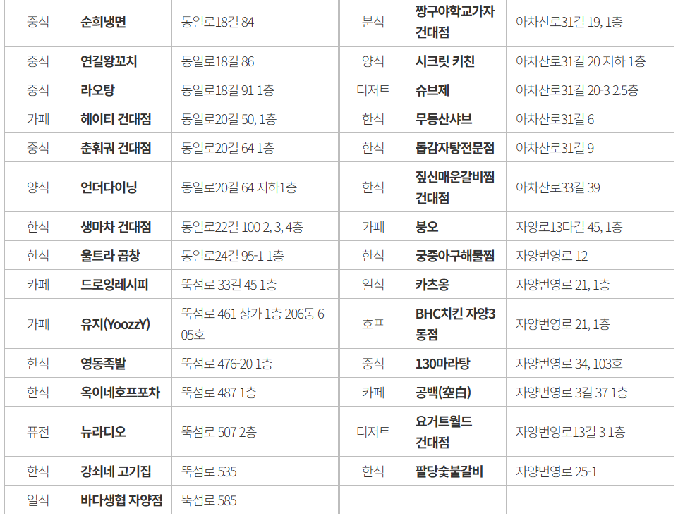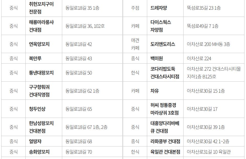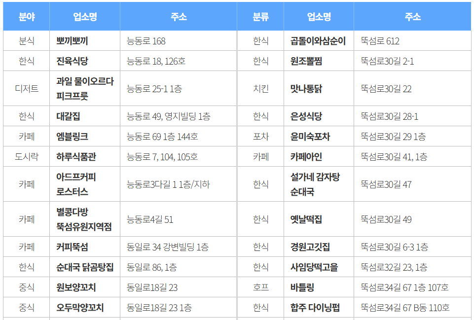 소상공인의 매출 증대 및 지역 상권 활성화를 위해 마련한 것으로, 뚝섬 한강공원 일대 외식업소 73개소가 참여합니다. 소상공인단체 • 광진구 상인화 등과 협력하여 가격 할인 참여업체를 사전에 모집했습니다. 참여업소 73개소는 하단 링크를 통해 지도로 확인할 수 있습니다.