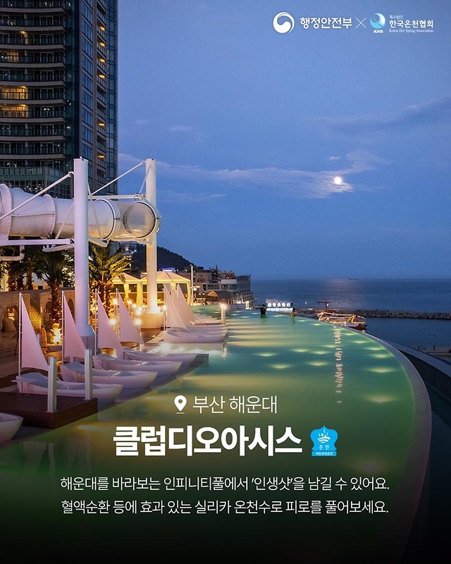 해운대를 바라보는 인피티티풀에서 인생샷을 남길 수 있고 혈액순환 등에 효과 있는 실리카 온천수로 피로를 풀 수 있습니다. 커플분이 여행가시기 좋은 곳입니다.
