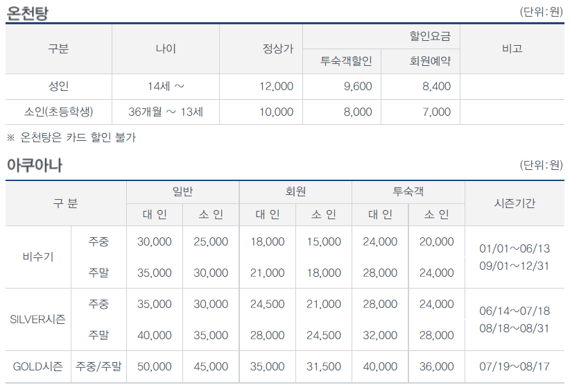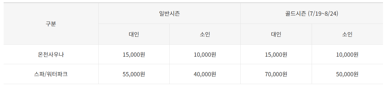 26m 높이의 대형 미끄럼틀을 비롯한 9종의 물놀이 시설을 갖추고 있으며 바데풀과 노천 온천탕도 함께 즐길 수 있어 가족 온천 여행으로 좋습니다. 또한 야외 워터파크는 동양 최대 26m 높이의 스피드 슬라이드와 트위스트 슬라이드, 부메랑&슈퍼볼 등 다양한 슬라이드류, 그리고 바다를 담은 듯한 파도풀은 스릴 만점의 아찔함을, 남녀노소 한가로이 즐길 수 있는 250m 길이의 유수풀과 25m 수영장은 여유로운 즐거움을 선사하며 건강함을 가득 담은 노천오행탕은 여러분의 피로까지 씻어줄 것입니다.