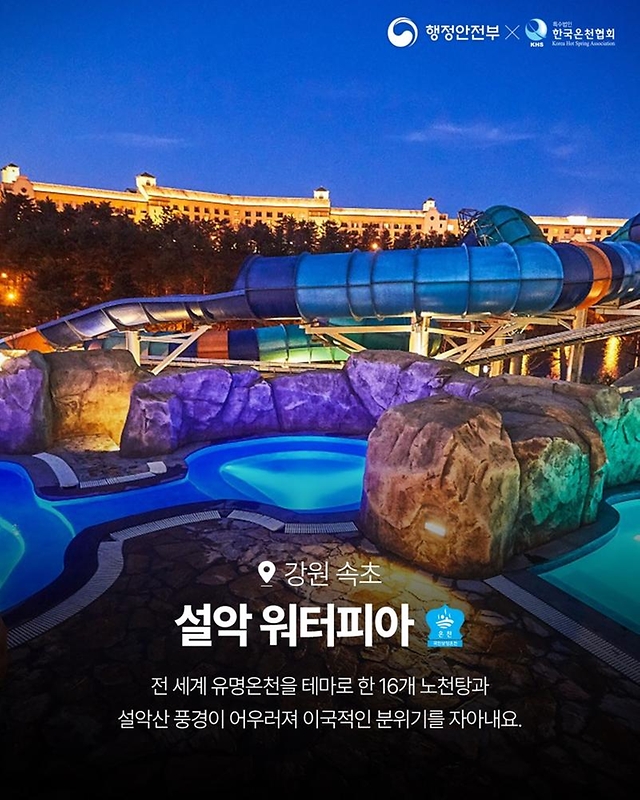 전 세계 유명온천을 테마로 한 16개 노천탕과 설악산 풍경이 어우러져 이국적인 분위기를 자아내며 워터파크 시설이 잘 되어 있고 속초 바다를 즐기면서 온천 여행을 가족분 들과 하기에 적합한 곳입니다.