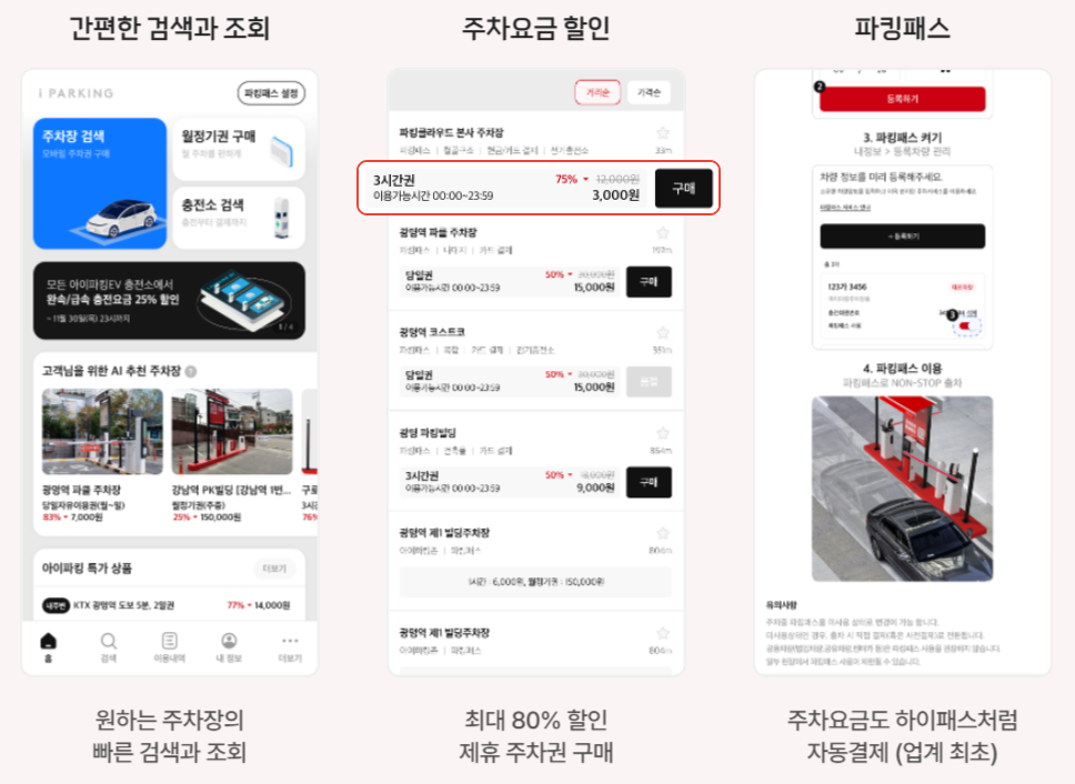 아이파킹은 국내 최대 민간 주차장 운영 네트워크를 가지고 있고 제휴 주차장을 보유하고 있어 전국적으로 활용도가 높습니다. 무인화 완성도가 높아 진입부터 출차까지 100% 자동화되어 있고 회사 등 단체 제휴가 가능하여 업무용 차량 주차에도 좋습니다.