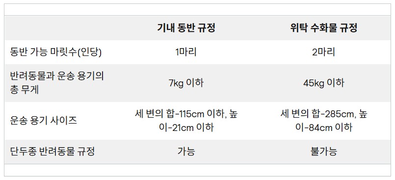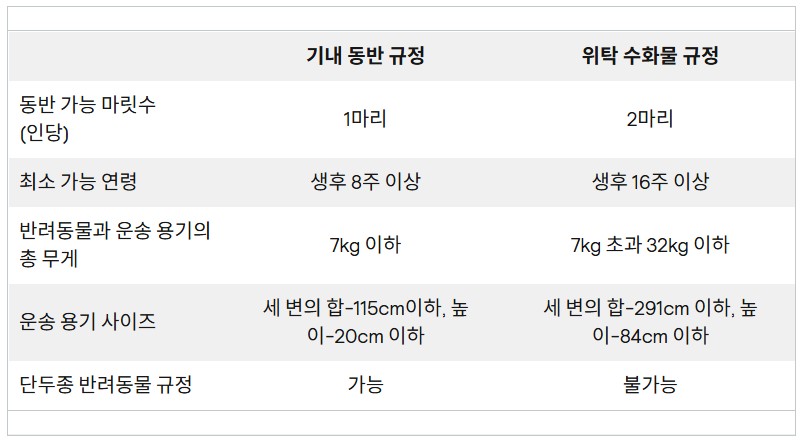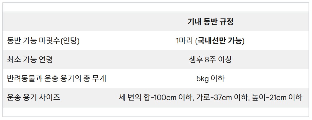 🐶 기내 동반 시, 6개월 미만의 강아지나 고양이 2마리는 한 개의 케이지에 넣을 수 있음.