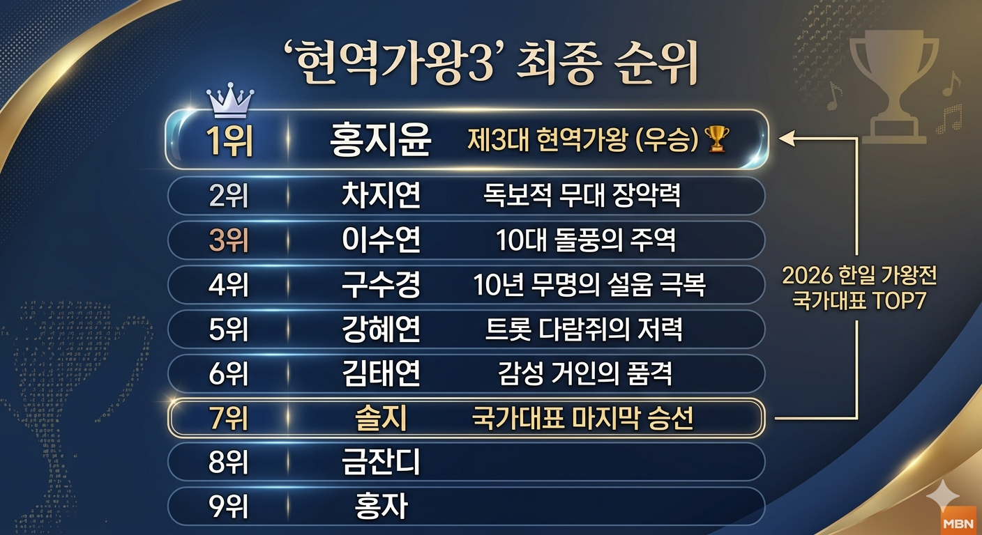 MBN의 인기 서바이벌 예능 **‘현역가왕3’**가 드디어 6개월간의 대장정을 마치고 제3대 가왕을 배출했습니다! 어제 방송된 파이널 생방송은 그야말로 손에 땀을 쥐게 하는 명승부의 연속이었는데요.