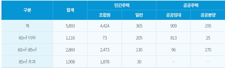 ○ 민간주택 : 4,789세대(조합원 4,424,일반 365), 공공주택 : 1,104세대(임대 909, 분양 195)