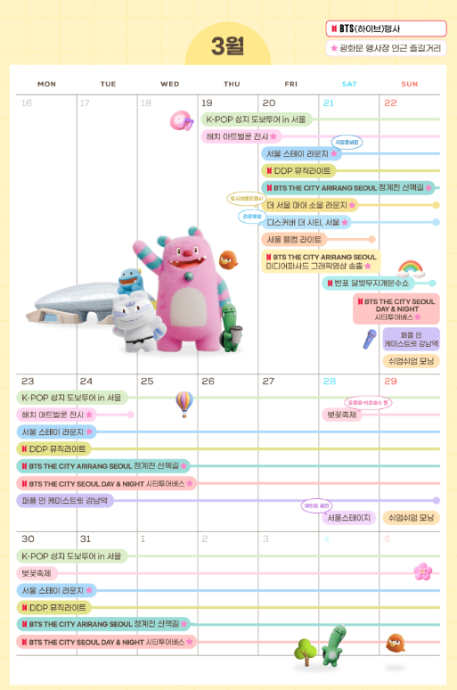 ‘더 시티 아리랑 서울(3.20.~4.12.)’ 기간 동안 DDP 외벽에 BTS 신곡에 맞춰 음악과 빛이 하나로 연결되는 미디어파사드 라이트쇼 등 서울 곳곳에서 펼쳐지는 다양한 프로그램 일정은 캘린더와 가이드북을 통해 확인할 수 있다.